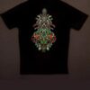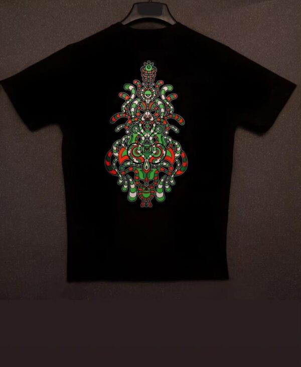 A stunning full-length psychedelic mandala totem, built with layered curves, complex symmetry, and neon-inspired colours. This artwork creates a powerful visual flow, making the back of the tee a true statement piece.