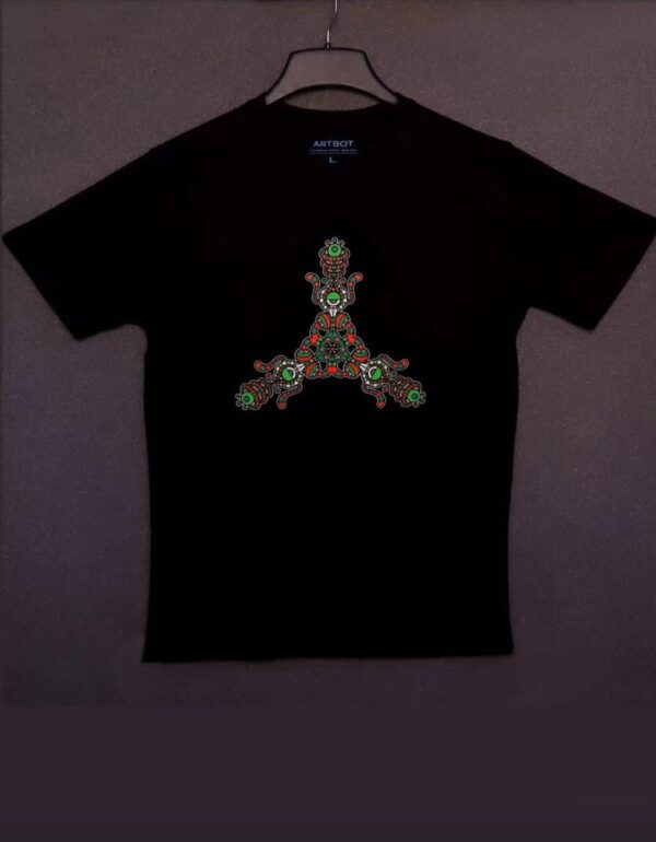 Unleash your artistic energy with this striking Artbot signature T-shirt, crafted for those who love bold colours and intricate detailing. Designed on a premium black base, this tee features:
