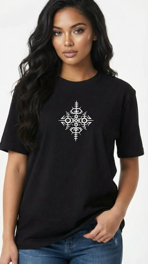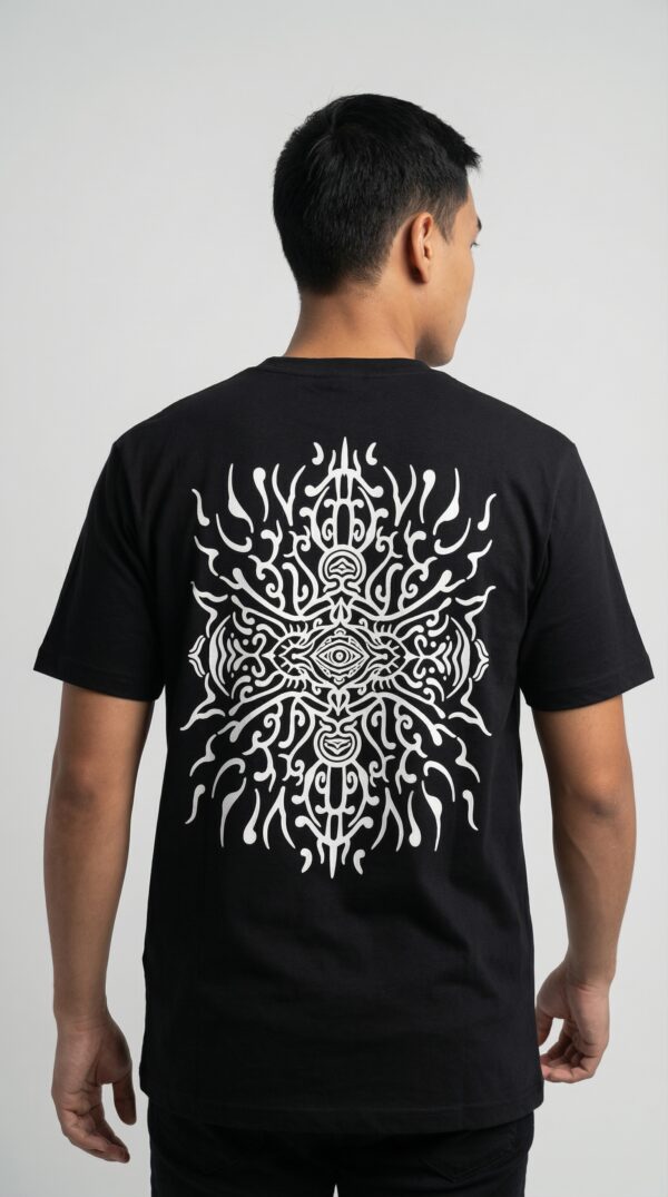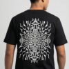 Printed in crisp flat white ink on a deep black base, the design stands out sharply, highlighting the symmetry, curves, and psychedelic flow of the artwork. The tee is crafted from soft, breathable, high-quality cotton, ensuring comfort, durability, and all-day wearability.